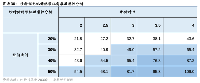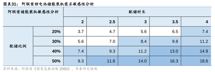 4) 扣除掉制氢的风光装机后,我们对沙特和阿联酋基于配储比例(20%-50%)和配储时长(2h-4h)进行了锂电池储能装机的敏感性分析,中性配储30%/3h需求可达57.4GWh,乐观配储50%/4h需求可达127.6GWh。