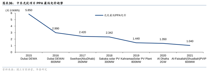 3) 新能源投资回报率低,属于价格敏感型市场,对报价要求高。中东具有丰富的油气资源优势,传统能源价格较低,导致当地新能源上网电价也较低。中东地区光伏PPA电价多次创下全球最低记录,2021年4月,沙特600MW的Al Shuaibu光伏IP项目,以1.04美分/kWh的中标价创下全球最低记录。中东新能源投资回报率不高,业主对成本相对敏感,具备成本优势的企业将更容易获得订单。
