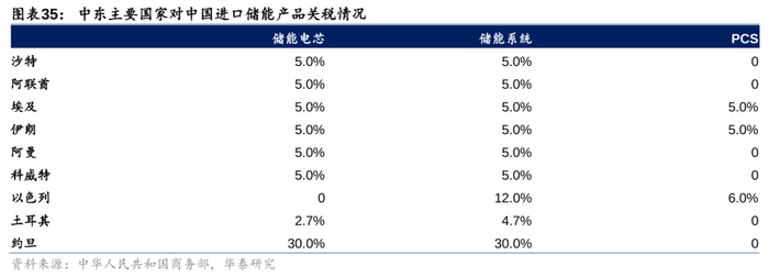 中东对中国进口光储产品关税普遍较低,给予中国企业友好的出口环境。根据商务部,沙特/阿联酋/埃及/伊朗/阿曼/科威特/土耳其对储能电芯以及储能系统的进口关税均在5%及以下,沙特/阿联酋/阿曼/科威特/土耳其/约旦对PCS的进口关税均为零,关税的贸易较低。