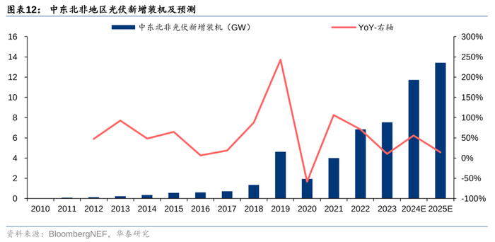 中东北非地区23年光伏装机接近8GW,BNEF预计24年将近12GW。根据BNEF统计,2023年中东北非光伏新增装机接近8GW,其预测24年/25年的新增光伏装机将达到近12GW/14GW,24年增速超50%。分国家来看,沙特/阿联酋/埃及23年新增装机分别为1.5/2.3/0.3GW,BNEF预计24年将增长至2.0/2.7/1.1GW。