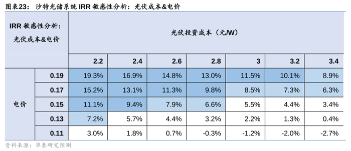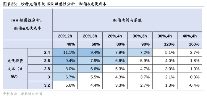 资源禀赋佳+光储系统成本低,中东光储系统或初步具备经济性。我们以沙特为例,对中东的光储项目的IRR进行了测算。假设光伏每年有效利用小时数为2500h,光伏投资成本为2.8元/W,其中光伏组件成本为0.8元/W,储能系统成本为0.85元/Wh,配储比例为20%/3h,项目使用年限为25年,光伏PPA电价为0.15元/kWh,储能在第12年以原成本的60%进行设备更新,无相关补贴,我们计算得到光储项目的IRR为6.6%,已初步具备经济性。随着未来光储成本的下降,光储项目有望进一步实现平价而实现放量。