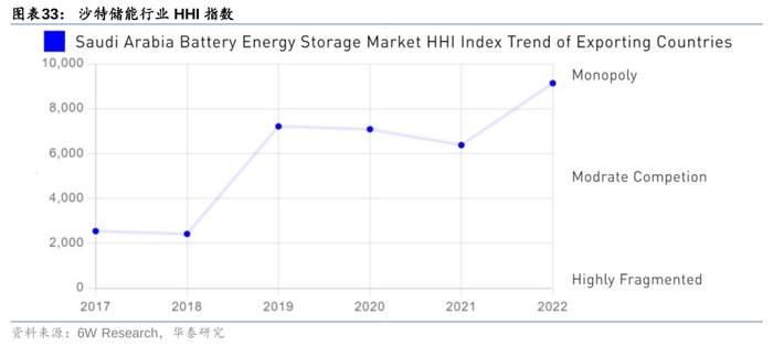 中东储能市场高度集中,阳光电源稳居集成龙头地位。根据6W Research统计,沙特阿拉伯电池储能市场2023年的HHI指数达9136,远高于2017年2541的水平,市场规模快速集中。鉴于“大业主+大项目+资质要求高”的特性,我们认为中东储能市场的高集中度有望持续保持。我们根据公开订单信息梳理,测算得到中东储能市场的竞争格局,阳光电源以70.58%的市占率位居第一,比亚迪与华为分别位居第二第三,高集中度特性显著。