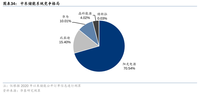 阳光电源、华为等国内储能厂商兼具项目经验、财务稳定性、技术能力、成本优势、进入短名单等多项优势,在市场中的拿单能力显著优于其他类型的厂商。但是,专注于组串式方案的华为等厂商在技术路径与成本上呈现出一定的劣势,22年以后华为在中东的订单也有所下滑,阳光电源作为专注集中式路径的储能龙头,在中东市场表现出很强的阿尔法属性。