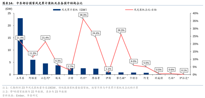 中东风光累计发电装机占比仅8.8%,仍有较大提升空间。根据Ember统计,23年中东整体风光累计装机达48.55GW(部分国家为22年数据),风光装机占比仅8.8%,与大力发展新能源的欧洲(整体风光装机占比达30.9%)相比,中东各国仍有较大提升空间。分国家看,土耳其风光累计装机量达22.99GW,在其能源装机结构中占比21.4%,阿联酋风光累计装机6.02GW,占比11.3%,以色列风光累计装机4.55GW,占比21.4%。约旦、黎巴嫩、摩洛哥等小国家均大力发展新能源,风光装机占比在20%以上,其余国家风光装机占比均在10%以下。
