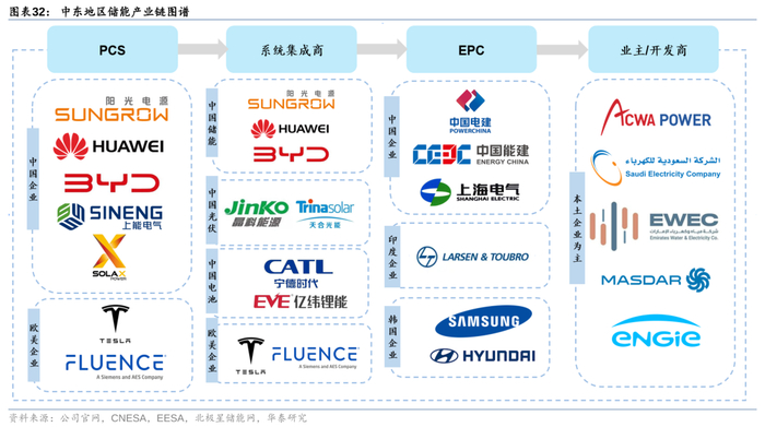 2) EPC厂商:EPC厂商在储能产业链中负责项目的设计、采购、施工和安装。在中东地区,EPC厂商主要为中国、印度和韩国的企业——中国的中国电建、中能建、上海电气等企业,印度的L&T,以及韩国的三星、现代等公司,都在中东地区的EPC市场中占有一席之地;