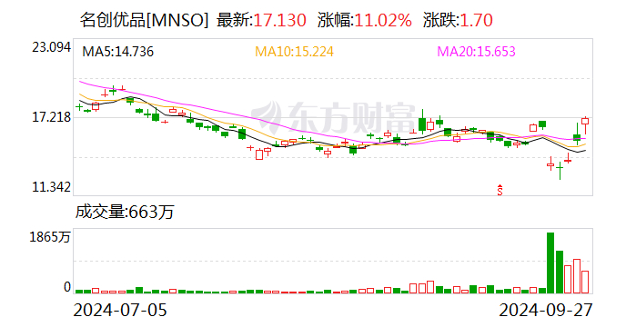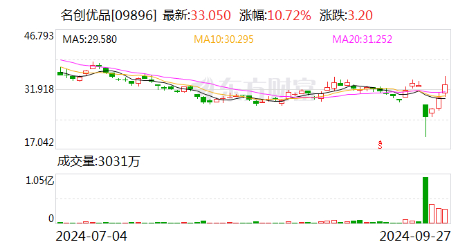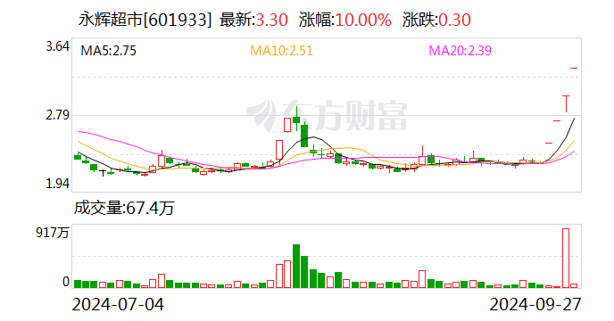 9月23日晚,名创优品(09896.HK)宣布收购永辉超市股份,收购完成后,名创优品实控的骏才国际成为永辉超市第一大股东。消息一出,永辉超市24日涨停,股价连涨4天。9月27日收盘,永辉超市股价上涨10%至3.30元/股。