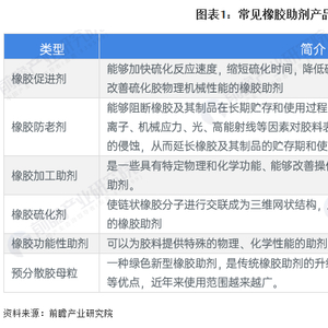 橡胶助剂是在橡胶加工成具备优良弹性和使用性能的橡胶制品过程中必须添加的一系列精细化工产品的总称。较为常见的橡胶助剂产品包括橡胶防老剂、橡胶加工助剂、橡胶硫化剂及过氧化物、特种功能性助剂和预分散胶母粒。