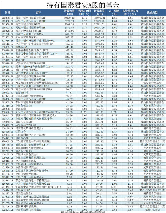 据悉,国泰中证全指证券公司ETF合计持有上述两家公司超30亿元市值的股票。分别持有国泰君安1.02亿股,持股市值为13.81亿元;持有海通证券2.18亿股,持股市值为18.68亿元。