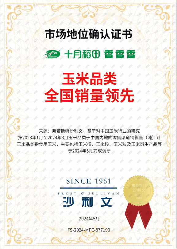 自十月稻田玉米上市以来,短时间内就取得了亮眼成绩,并在电商商城、社交平台上好评不断。截至今年7月底,十月稻田玉米单品链接在抖音销量已突破1000万单。不仅如此,十月稻田的玉米还荣获行业认证。根据弗若斯特沙利文数据,截止2024年3月,十月稻田玉米品类全国销量领先。