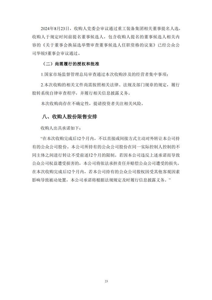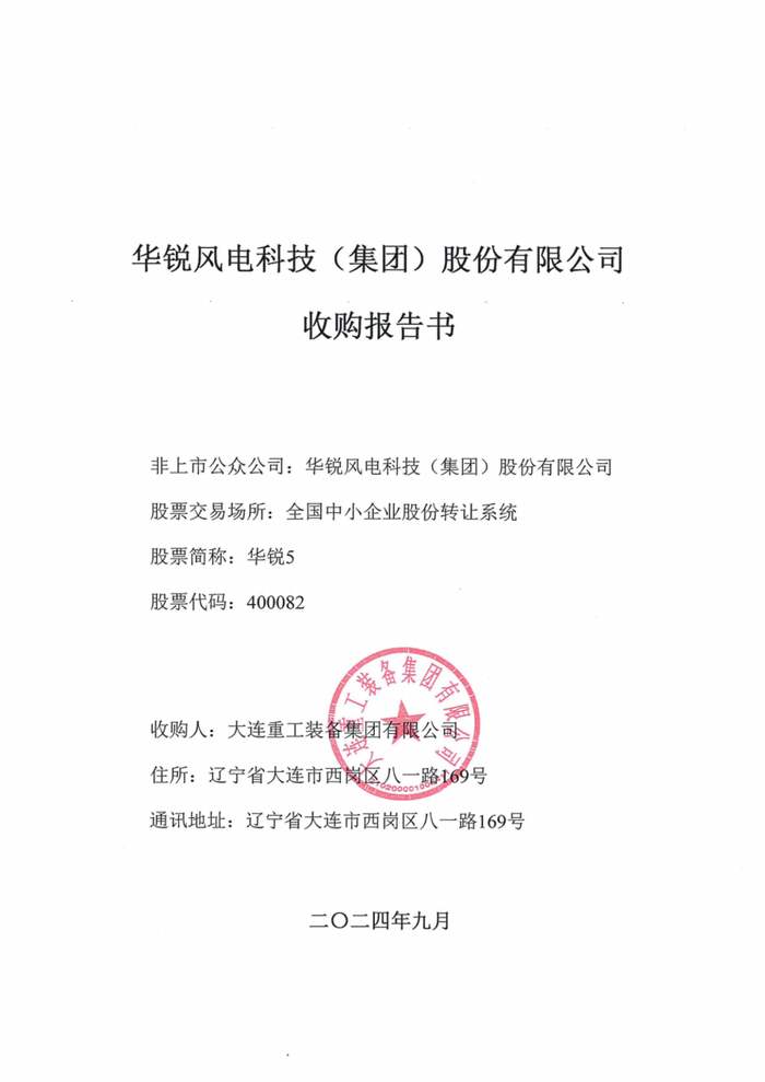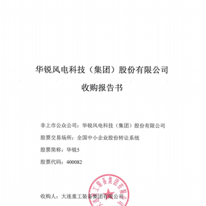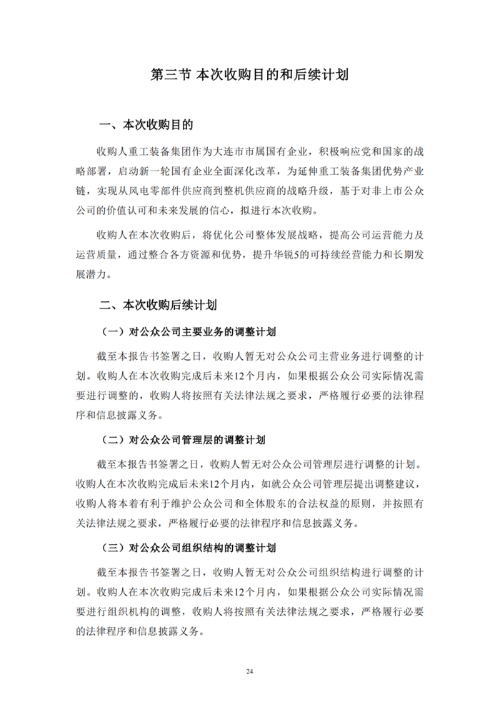 对于收购目的,《收购报告书》公告显示,收购人重工装备集团作为大连市市属国有企业,积极响应党和国家的战略部署,启动新一轮国有企业全面深化改革,为延伸重工装备集团优势产业链,实现从风电零部件供应商到整机供应商的战略升级,基于对非上市公众公司的价值认可和未来发展的信心,拟进行本次收购。收购人在本次收购后,将优化公司整体发展战略,提高公司运营能力及运营质量,通过整合各方资源和优势,提升华锐风电的可持续经营能力和长期发展潜力。