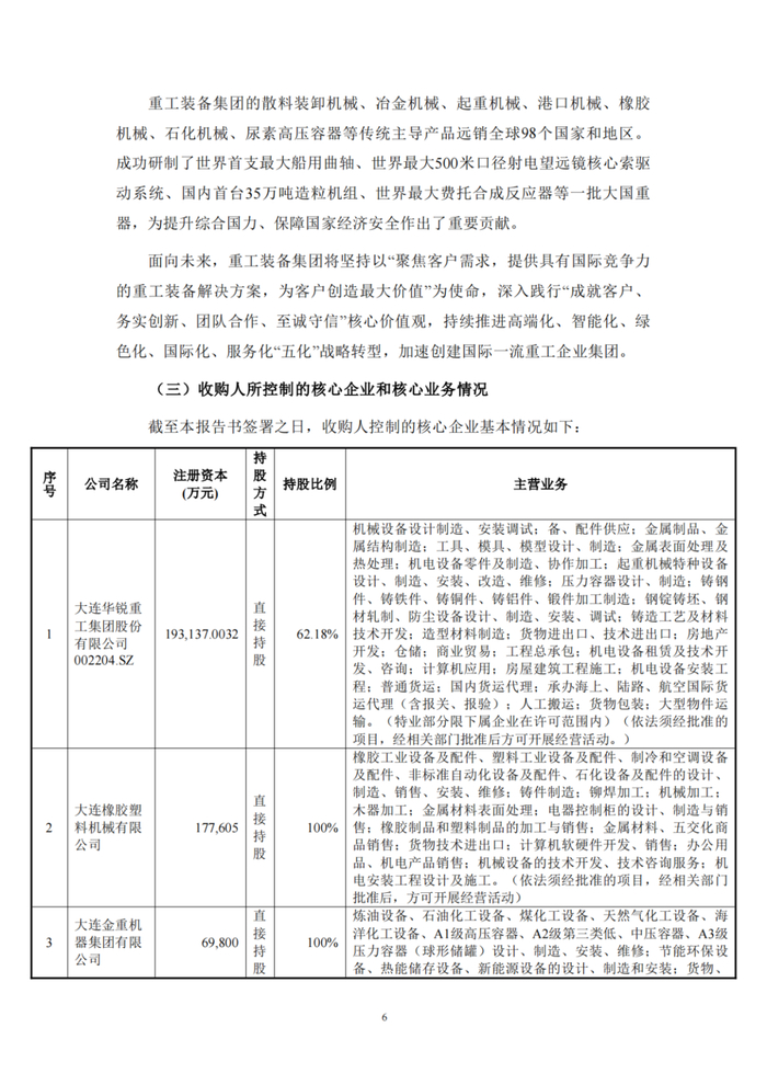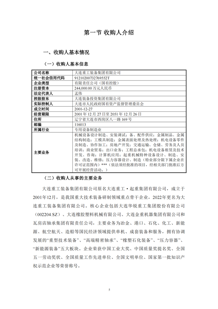 大连重工装备集团有限公司原名大连重工·起重集团有限公司,成立于2001年12月,是我国重大技术装备研制领域重点骨干企业,2022年更名为大连重工装备集团有限公司。核心企业包括大连华锐重工集团股份有限公司(002204.SZ)、大连橡胶塑料机械有限公司、大连金重机器集团有限公司和瓦房店轴承集团有限责任公司,主要业务为冶金、港口、石化、化工、新能源、航空航天、造船等国民经济领域提供单机、成套装备和服务,拥有协调发展的“重型技术装备”、“高端精密轴承”、“橡塑石化装备”、“压力容器”“新能源装备”五大板块。