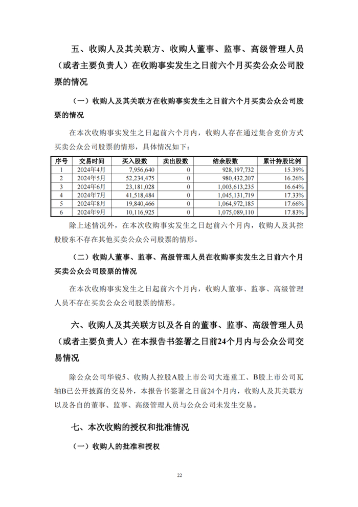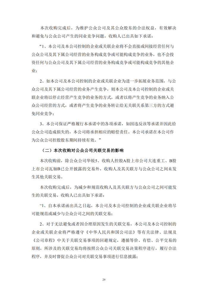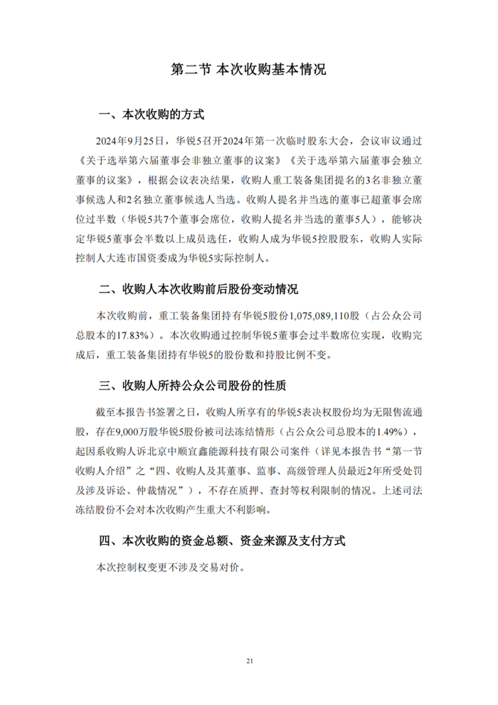 《收购报告书》显示,大连重工装备集团有限公司提名的5名董事候选已正式当选,当选董事已超董事会席位过半数,使得华锐风电控股股东发生变更,由无控股股东变更为大连重工装备集团有限公司。大连重工持有华锐风电17.83%股权,收购完成后股权不变。