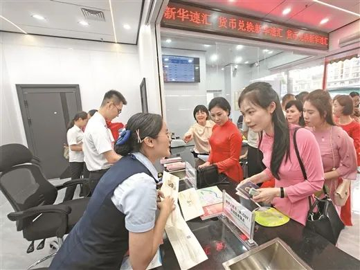 入境人员在全国边境口岸首个境外来宾金融综合服务中心办理外币兑换业务。