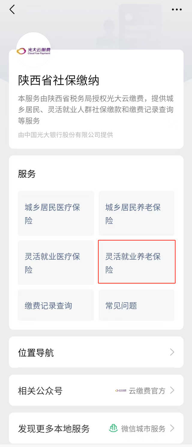 光大银行:微信城市服务、“社保云缴费”小程序、云缴费APP、手机银行;