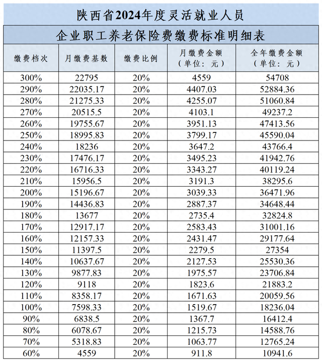 2023年度陕西省全口径城镇单位就业人员平均工资为91180元,个人月缴费基数上限标准为22795元,下限标准为4559元,缴费比例为20%。灵活就业人员可在本年度缴费基数上下限之间选择适当的缴费基数档次缴费,具体缴费基数档次标准如下: