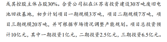 事实上,赣锋锂业早在7月就披露了这一消息。根据签署的《战略合作协议》,合资公司拟在江苏省投资建设30万吨废旧电池回收基地,初步计划项目一期至三期规模分别为3万吨、7万吨、20万吨,项目总投资预计10亿元。