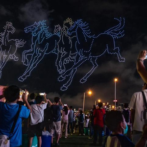这场以“香港马腾盛世”为主题的无人机表演由香港旅游发展局主办,为庆祝中华人民共和国成立75周年而举行。当天19时许,湾仔海滨已人头攒动。人群中有提前来“霸位”的摄影“发烧友”,竖起三脚架,静候表演开始;也有旅客携家带口特地从中国内地前来,在湾仔海滨草坪上席地而坐,边品尝美食边等待。