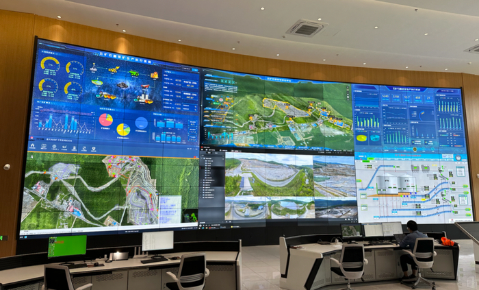 △在萝北石墨生产基地的智慧管控中心,巨大屏幕上,矿山生产运营的所有实时数据一目了然。在这里,技术人员只需动动手指,就可以随时查看矿区各环节生产情况,调动整个矿山和生产线的各个环节。