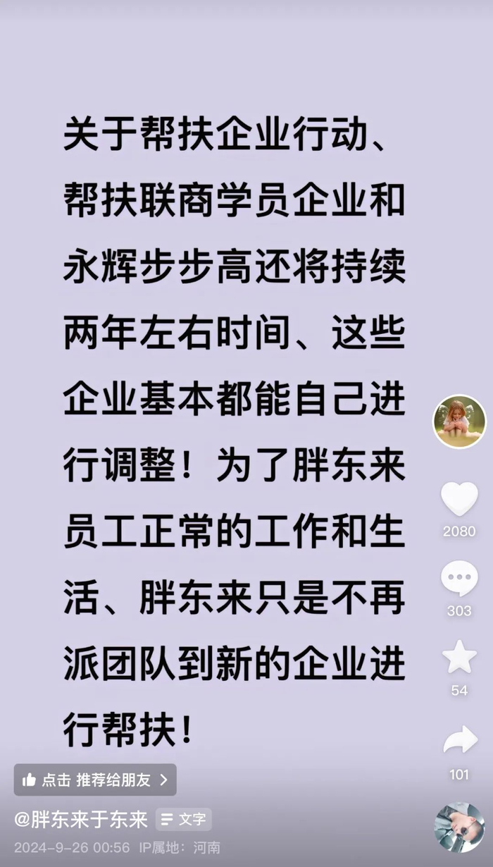 胖东来创始人于东来9月26日在抖音账号上发文表示:“关于帮扶企业行动、帮扶联商学员企业和永辉步步高还将持续两年左右时间、这些企业基本能自己进行调整!为了胖东来员工正常的工作和生活、胖东来只是不再派团队到新的企业进行帮扶!”