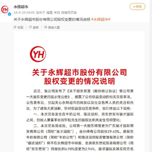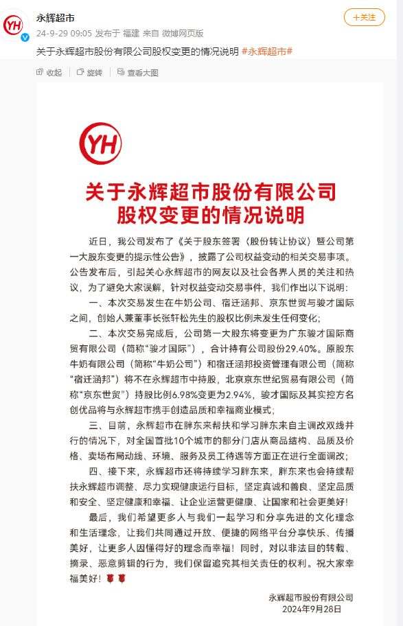 9月29日上午,永辉超市在官方微博发布《关于永辉超市股份有限公司股权变更的情况说明》(以下简称:《说明》)。