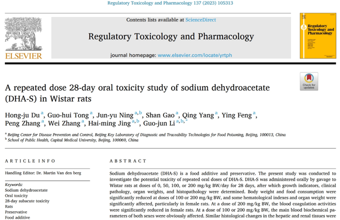 2 Du, HJ; Tong, GH; (...); Li, GJ. A repeated dose 28-day oral toxicity study of sodium dehydroacetate (DHA-S) in Wistar rats. Regulatory Toxicology and Pharmacology, 2023,137:105313
