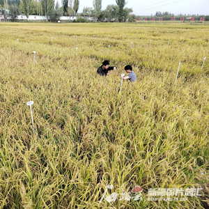 9月29日,工作人员在喀什市帕哈太克里乡中农海稻喀什科研试验基地查看水稻长势。