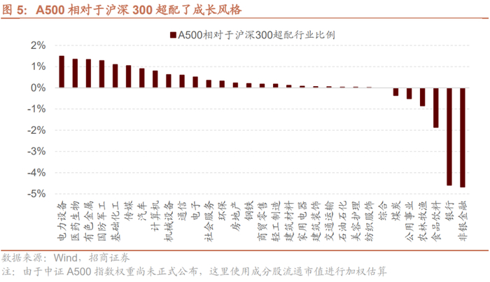 不过另外值得重视的边际变化是,中证A500ETF共募集200亿,将于近期集中建仓,中证A500因为行业覆盖面更广,每个中证三级行业龙头都包含,也可能成为后续重要机构投资者增持的方向。相比沪深300,中证A500多了一些中盘股,同时在行业上,较沪深300超配了电力设备及新能源、医药、有色、军工、化工等更加偏成长和新质生产力的方向。