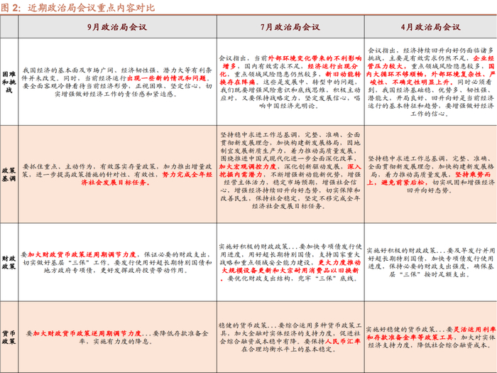 从本次9月政治局会议精神来看,接下来一段时间的政策将会围绕“努力完成全年经济社会发展目标任务展开”,从表述来看,重点的政策导向包括: