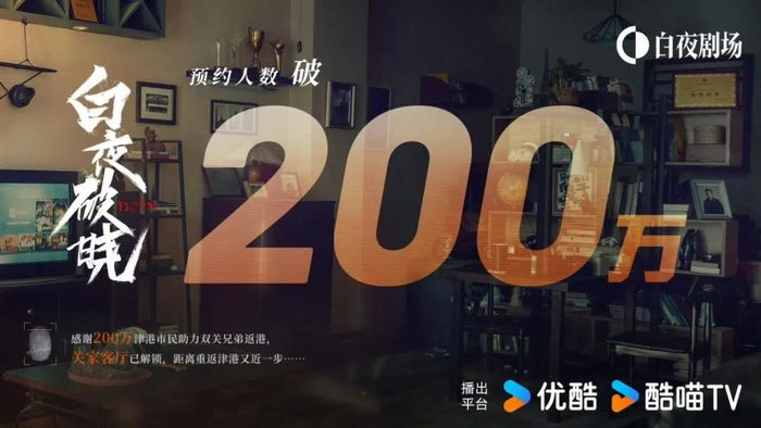 消息释出当天,话题#白夜破晓原班人马回归#火速冲上微博热搜榜,不到半年该剧在优酷站内的预约量突破200万。