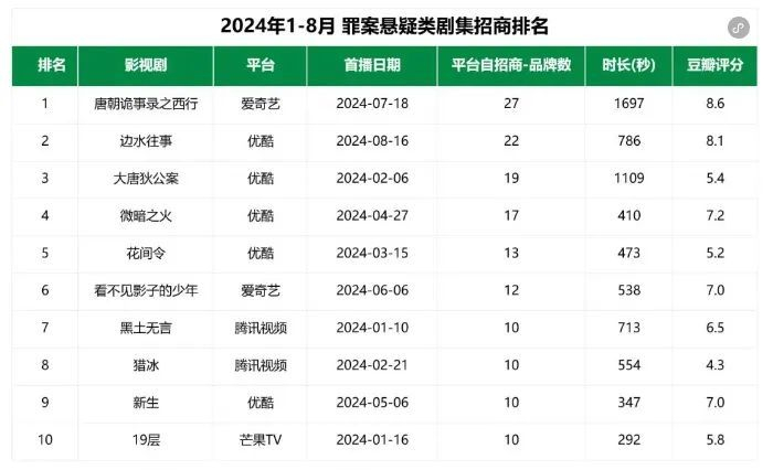 与此同时,在击壤洞察统计的2024年1-8月罪案悬疑类剧集招商TOP10中,“优酷出品”占据了半壁江山。其中除《新生》《边水往事》,“白夜剧场”面向市场的“开张之作”《微暗之火》也以17个平台自招商登上TOP4。