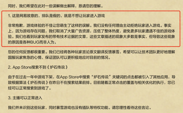 对于一些传闻,团队也进行了回应。尤其是对有玩家质疑“这是网易故意的,就是不想让玩家进入游戏”这一说法,运营团队表示,这是一种误解,“我们没有任何理由主动拒绝玩家进入游戏”。