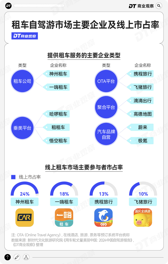结合新时代文旅研究院《2024年中国自驾游报告》来看,目前市场上大致可以分为租车公司、垂类平台、OTA平台、聚合平台和汽车品牌自营这五类。