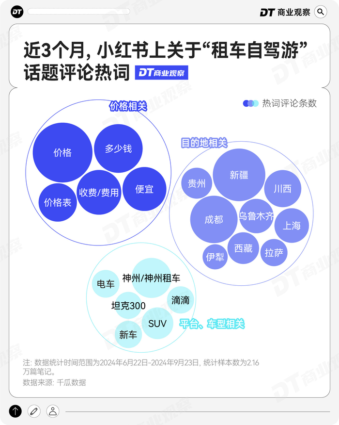 我们查看了小红书近3个月来和“租车自驾”相关的近2万篇笔记和评论区,发现大家最关心三类问题:和目的地相关的、和收费/价格有关的、和平台/车型有关的。