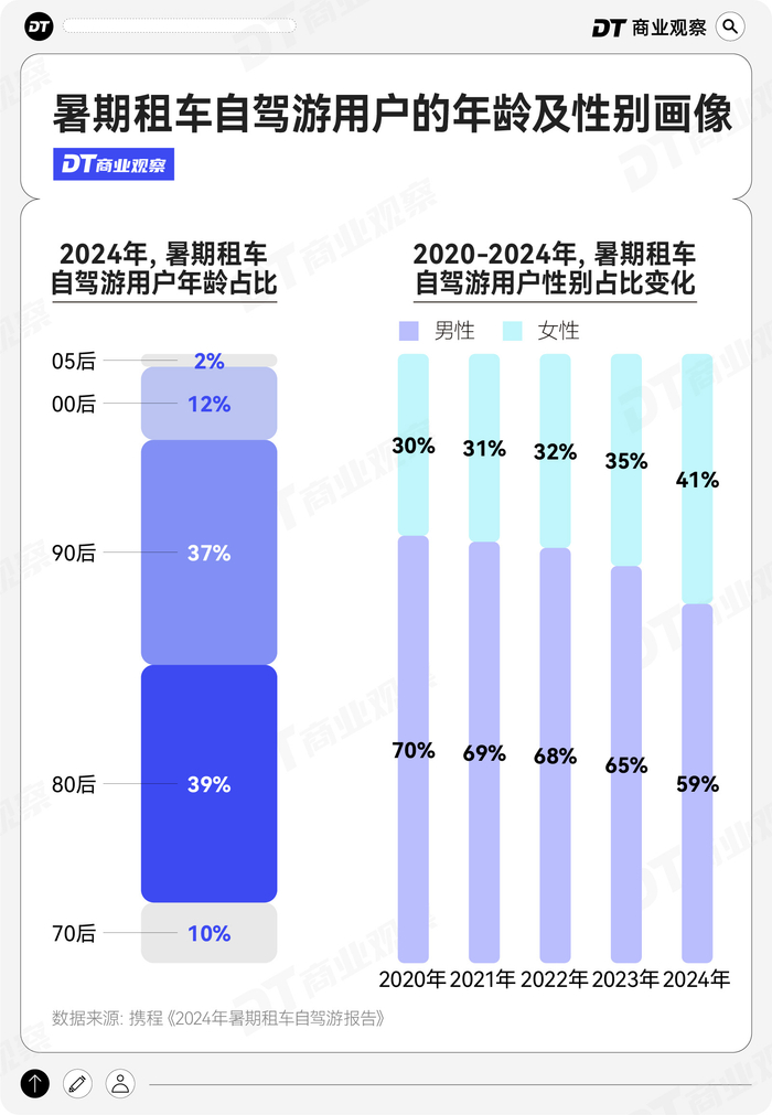据携程《2024年暑期租车自驾游报告》,携程租车自驾游用户80、90后分别占比39%、37%,累计占比超过七成,通常是和亲朋好友一起自驾出游。