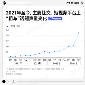 根据数说聚合的数据,“租车”在主要社交、短视频平台的内容声量除了在2023年第一季度有所回落,近三年都在平稳上升。
