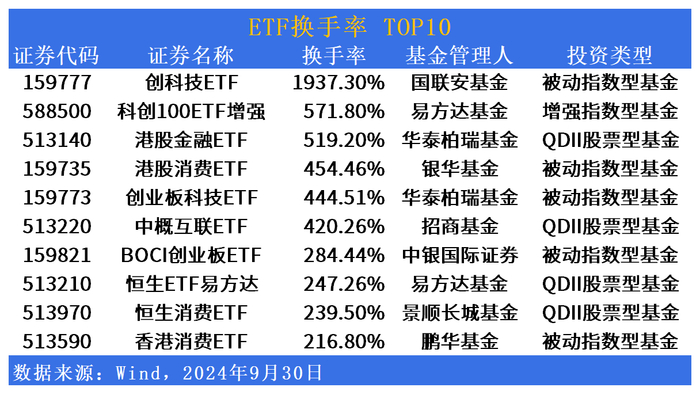 换手率方面,创科技ETF(159777)换手率近2000%。27只股票换手率超100%。