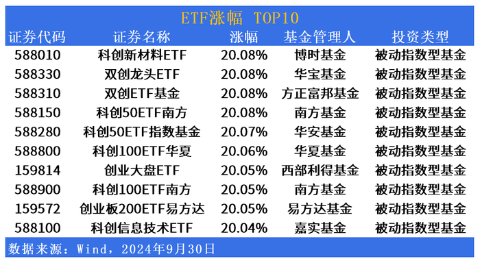 具体来看,科创新材料ETF(588010)、双创龙头ETF(588330)、双创ETF基金(588310)、科创50ETF南方(588150)、科创50ETF指数基金(588280)、科创100ETF华夏(588800)、创业大盘ETF(159814)等均涨超20%。