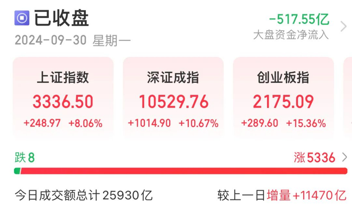 9月30日,A股三大股指涨势喜人,创业板指午后强势上攻,一度涨超16%,两市超5300只个股上涨,逾2300股涨超10%,超400股涨停。行业板块全线飘红。两市成交额突破2.59万亿元,刷新2015年5月28日创下的历史最高成交额。