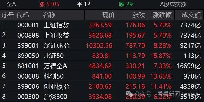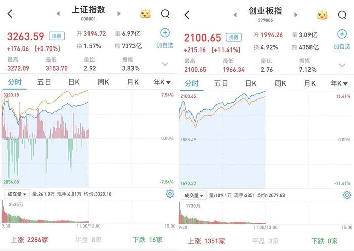 截至午间收盘,创业板指涨11.41%,突破2100点;沪指涨5.70%,深成指涨8.28%。科创50指数涨逾13%,北证50指数涨超15%,均创历史最大单日涨幅。