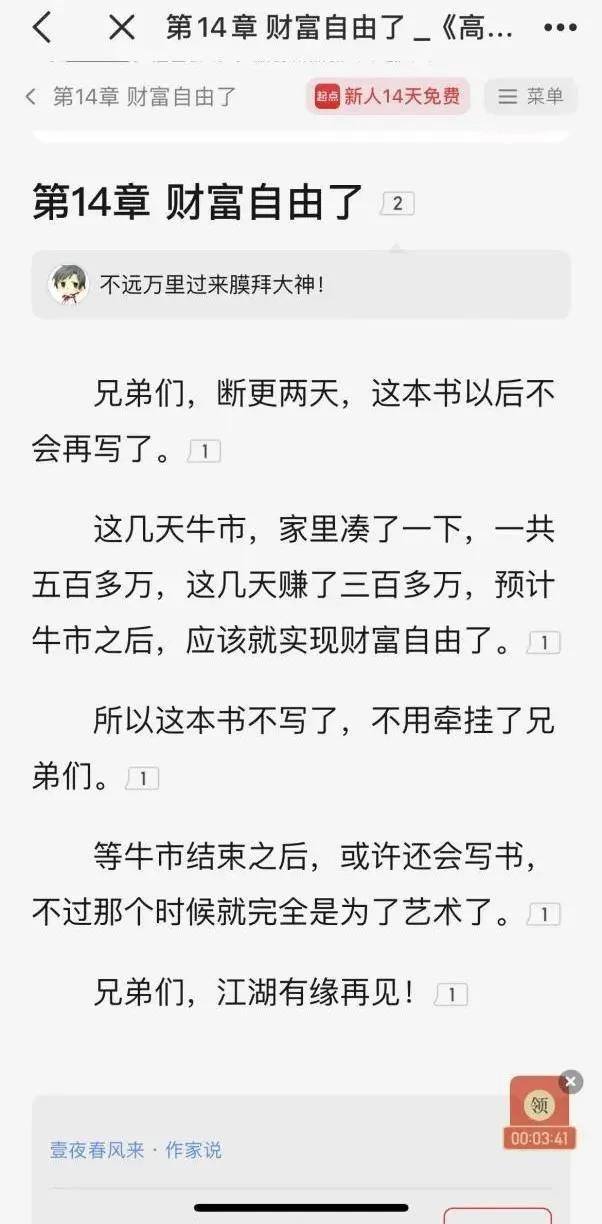 甚至有人几天前还在写网络小说赚钱,几天后就断更,称即将财富自由:“这几天牛市,家里凑了一下,一共五百多万,这几天赚了三百多万,预计牛市之后,应该就实现财富自由了。所以这本书就不写了。”