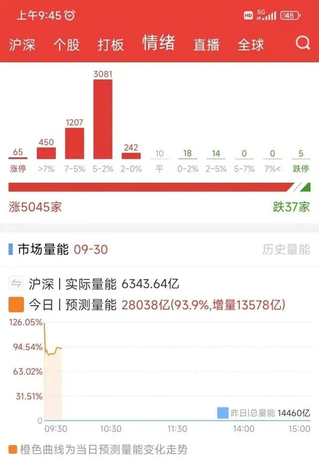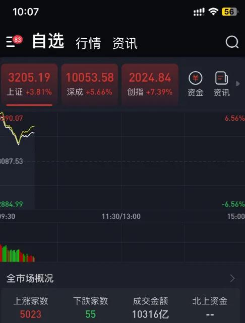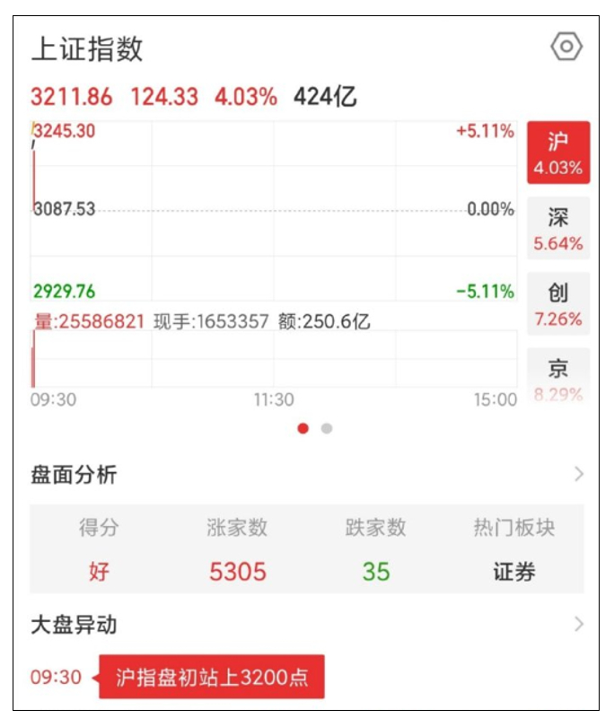 今日开盘,A股三大股指高开,沪指高开3.47%,成指高开 4.58%,创业板指高开 5.77%。数秒钟后,沪指冲上3200点。全市场超5000只股上涨,各板块普涨。