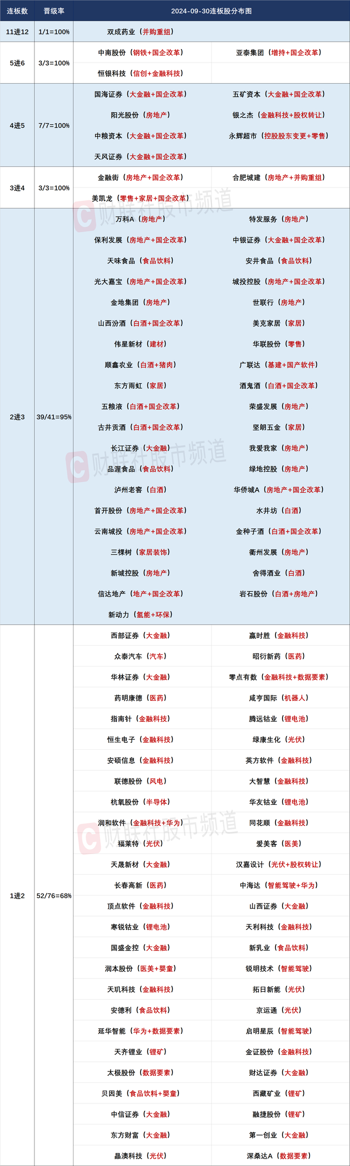 财联社9月30日讯,今日659股涨停,116股炸板,封板率为85%,双成药业12连板,亚泰集团、恒银科技、中南股份6连板,永辉超市、五矿资本、天风证券、国海证券、中粮资本、阳光股份5连板,银之杰20CM8天7板,金融街、合肥城建、美凯龙4连板,北交所华信永道30CM3连板,新动力、特发服务、品渥食品20CM3连板,万科A、保利发展、泸州老窖、中银证券等30余股3连板。创业板指9月单月上涨近38%,创单月涨幅历史纪录,沪指9月累涨17%。沪深两市成交超2.59万亿元,创出历史成交金额天量。截至收盘,沪指涨8.06%,深成指涨10.67%,创业板指涨15.36%。