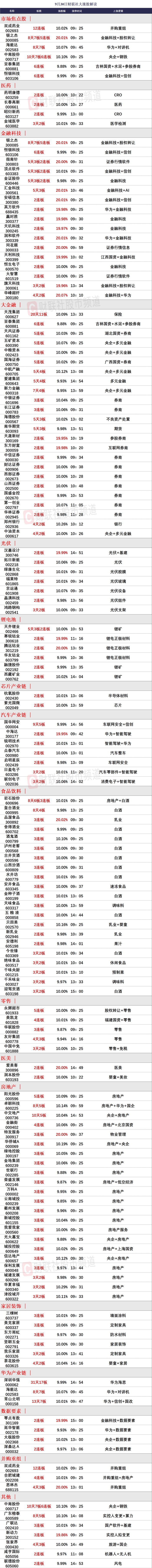 9月27日,中国人民银行发布公告,下调常备借贷便利利率20个基点,将隔夜、7天、1个月常备借贷便利利率分别调整为2.35%、2.50%、2.85%。此外,近日,经中央金融委员会同意,中央金融办、证监会联合印发《关于推动中长期资金入市的指导意见》,提出三方面的主要举措:建设培育鼓励长期投资的资本市场生态;大力发展权益类公募基金,支持私募证券投资基金稳健发展;着力完善各类中长期资金入市配套政策制度。大金融板块持续站上风口,中信证券、东方财富、天风证券、国海证券等四十余只券商股今日悉数涨停,其中东方财富成交306亿元续创历史天量。此外中国平安、新华保险、中国人寿三只保险股也悉数涨停。而金融科技作为整个大金融的情绪风向标同样涨势火爆,恒银科技继续缩量一字晋级6连板,指南针、同花顺、财富趋势等纷纷上板,若节后恒银科技、天风证券等前排个股不出现断板后的A杀,而后排个股层出不穷展开助攻,仍有利于整个大金融板块的持续性。