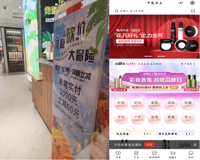 记者在该机场免税店注意到,店内有部分优惠活动,如单笔实付满1000元减60元。与线上渠道相比,9月周年庆期间,中免日上的基础折扣为满600元减60元。