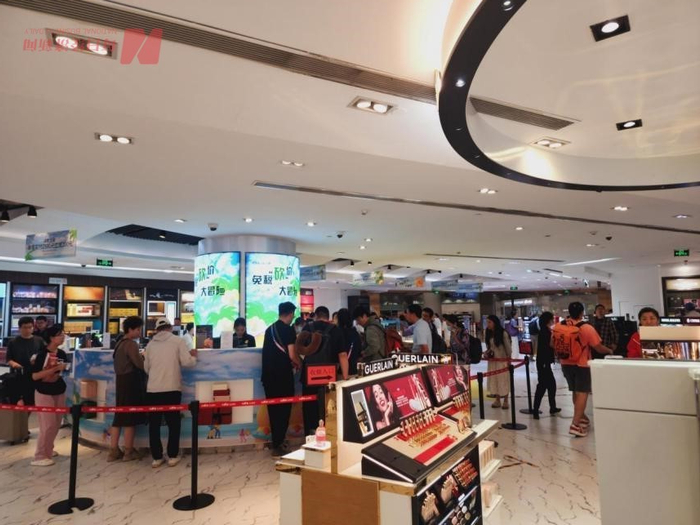 消费者在中国中免机场免税店内排队结账