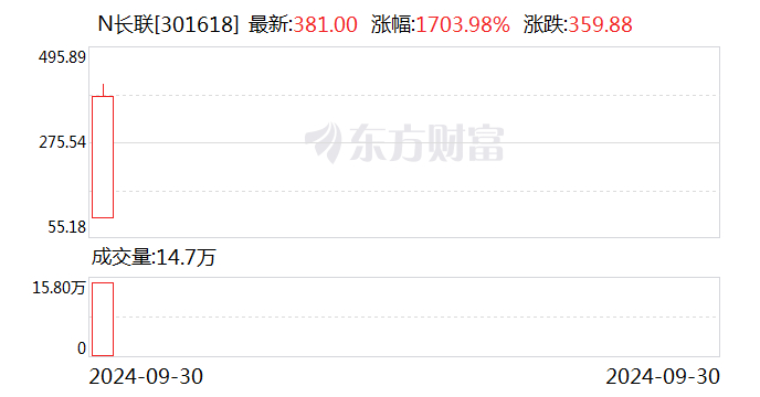 赶在九月的最后一个交易日,长联科技登陆创业板。截至9月30日收盘,长联科技股价为381元/股,涨幅为1703.98%,即使在A股“普天同涨”的时候,长联科技涨势仍然遥遥领先,是今日涨幅最高的股票。