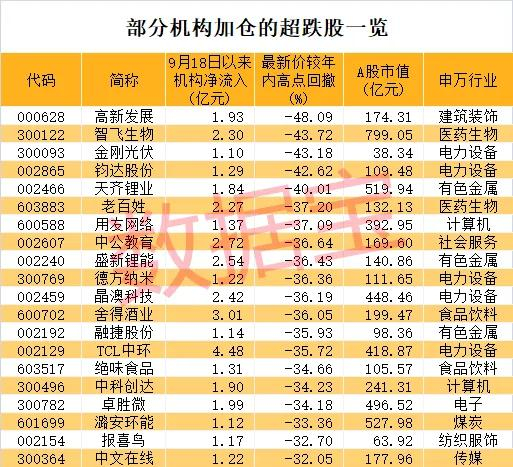 据数据宝统计,9月18日以来机构资金净流入超亿元,且最新收盘价较年内高点回撤30%以上的股票有20只。这20只股票当中,5股回撤幅度超过40%,分别是高新发展、智飞生物、金刚光伏、钧达股份、天齐锂业。