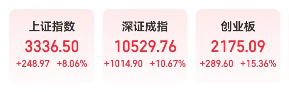 A股主要股指开启“狂飙”模式,其中上证指数大涨8.06%,创下2009年以来最大单日涨幅,最新指数突破3300点;深证成指大涨10.67%,最新指数突破10000点;创业板指大涨15.36%,创下历史单日最大涨幅,报收2175.09点。