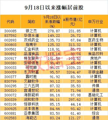 哪些牛股率先脱颖而出?据数据宝统计,不含近一个月上市的次新股,9月18日以来,接近200只股票累计涨幅在50%以上。7股累计涨幅已经翻倍,分别是银之杰、华信永道、双成药业、指南针、汇金科技、品渥食品、特发服务。