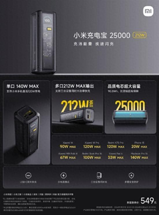 值得一提的是,小米充电宝25000 212W支持的最大单口功率达到了140W,并支持小米手机最高120W功率的快速充电。此外,它还能同时为三台设备提供65W+27W+120W MAX的充电功率,在双口同充模式下,功率可达65W+120W。